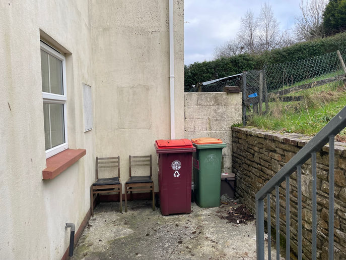 Back yard is walled in, steps up to garden area, mature trees, storage space for fuel and bins, built in coal bunker.