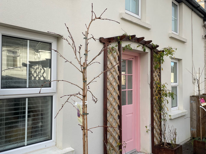 Back yard is private and spacious with steps leading up to a garden. Beautiful little sun trap!