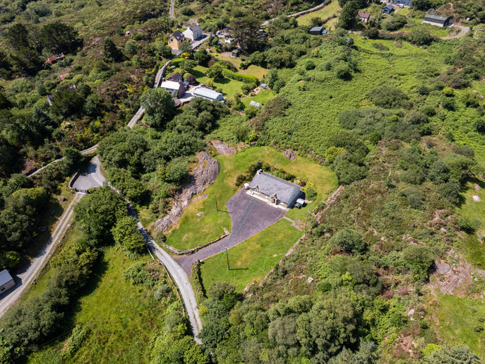 At Coolieragh, near both Glengarriff and Zetland Pier, sits this three bedroom single storey residence on ca. 0.7163 acre with elevated sea and coastline views. Accessed via a quiet country laneway this stone faced residence has a tarmac driveway and naturally landscaped grounds.