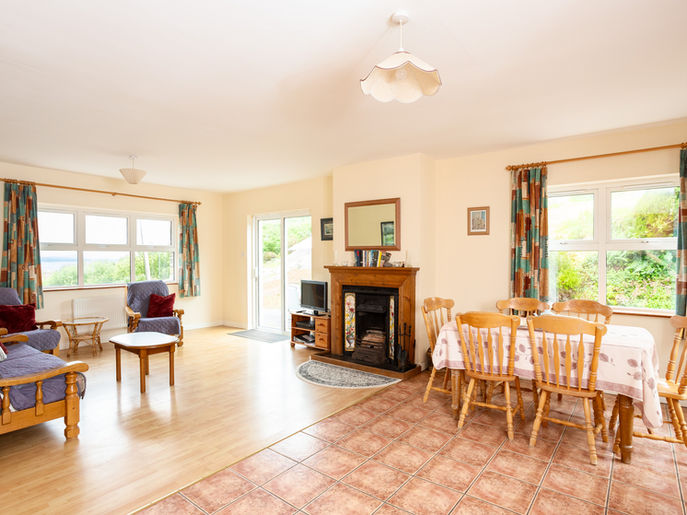 Open Plan Kitchen, Dining and Living:- 266 x 18 8. Front facing windows to sea views, patio door to front and side gardens, fully fitted kitchen and appliances, windows to side and rear gardens, solid fuel open fire with attractive surround. Dining area and kitchen are tiled while the living area has wood effect flooring.