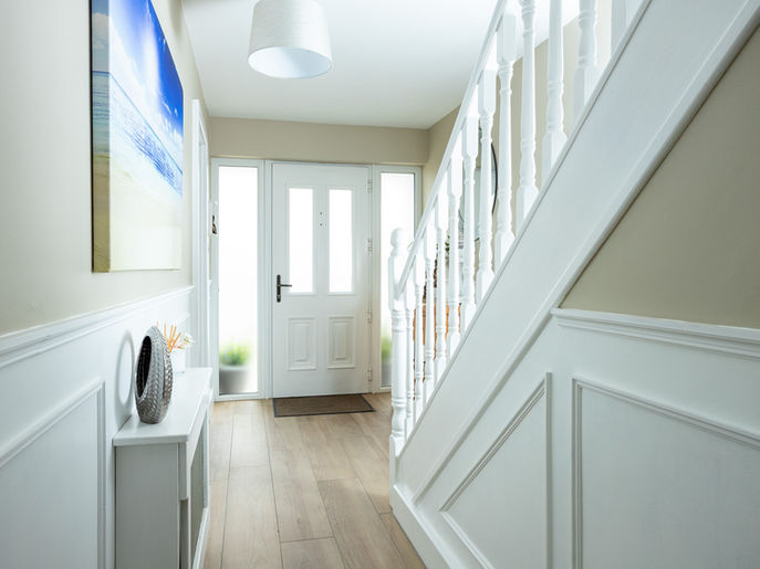 Front Entrance Hallway:- Wood effect flooring, stairwell to first floor, wc under stairwell which has tiled flooring and surround wc and wash hand basin, encased radiator in hallway, doors to living & kitchen/dining rooms.