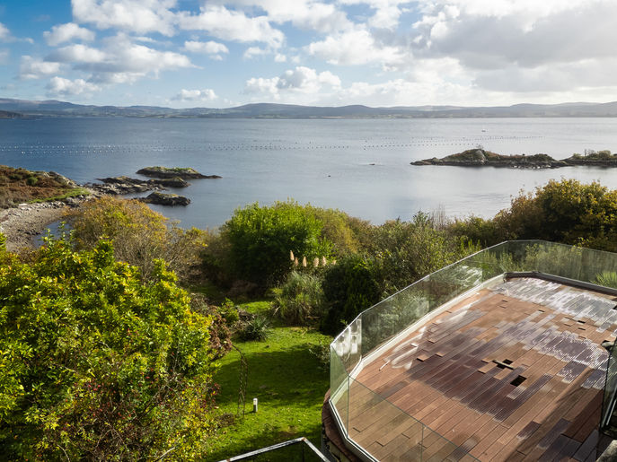 Entrance via Sun Room:- Complete glass surround with supremely elevated views of the cove, harbour and Bantry Bay, door to decking area, double doors to sitting room.