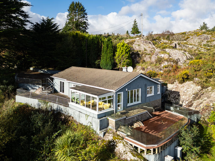 At the rugged entrance to Glengarriff Harbour and surrounded by a magnificent private cove sits this elevated residence and grounds. "The Moorings" enjoys on absolutely unique vantage point which guards the open bay and the inner harbour. All manner of marine activity is both audible and visible but crucially no sign of other residential activity, the peacefulness is amazing!